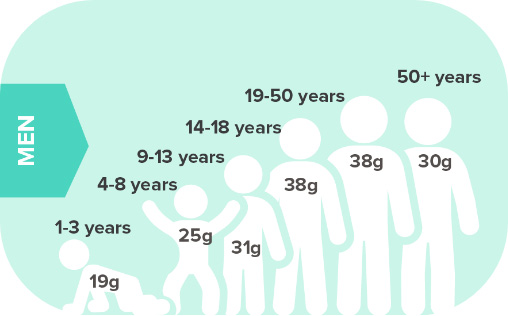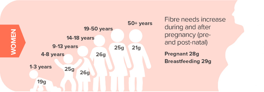 Recommendations for dietary fibre intake depend on age, gender, and life stage (such as pregnancy). Skip to the chart here.